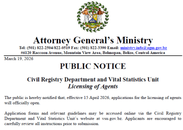 The public is hereby notified that, effective April 15th, 2026, applications for the licensing of agents will officially open Application forms and relevant guidelines may be accessed online via the Civil Registry Department and Vital